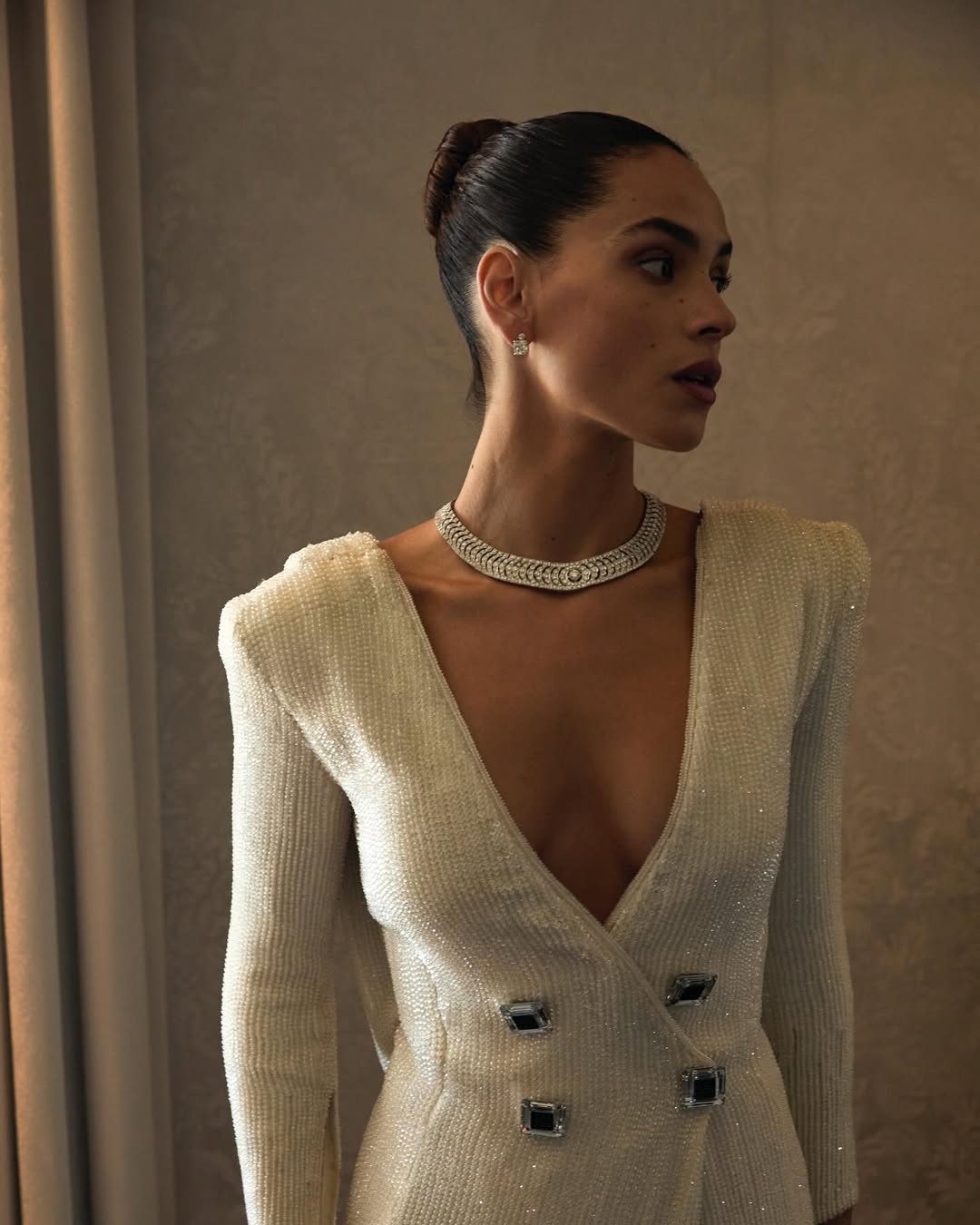 Adria‘s hair was styled in a high chignon by Jennifer Yepez, the chicest touch that complemented a dress that was already a statement in itself.