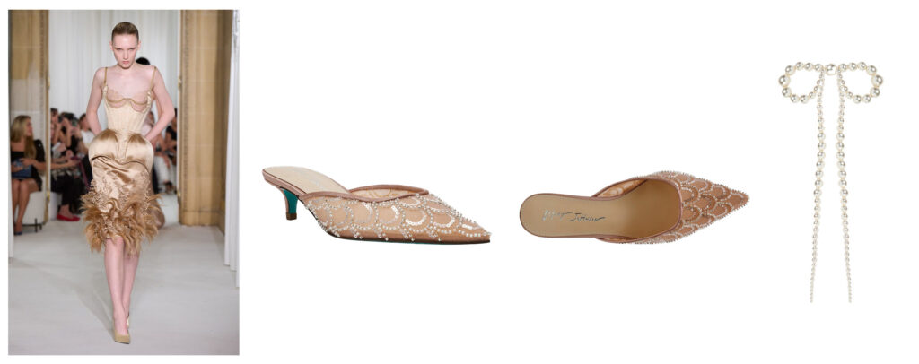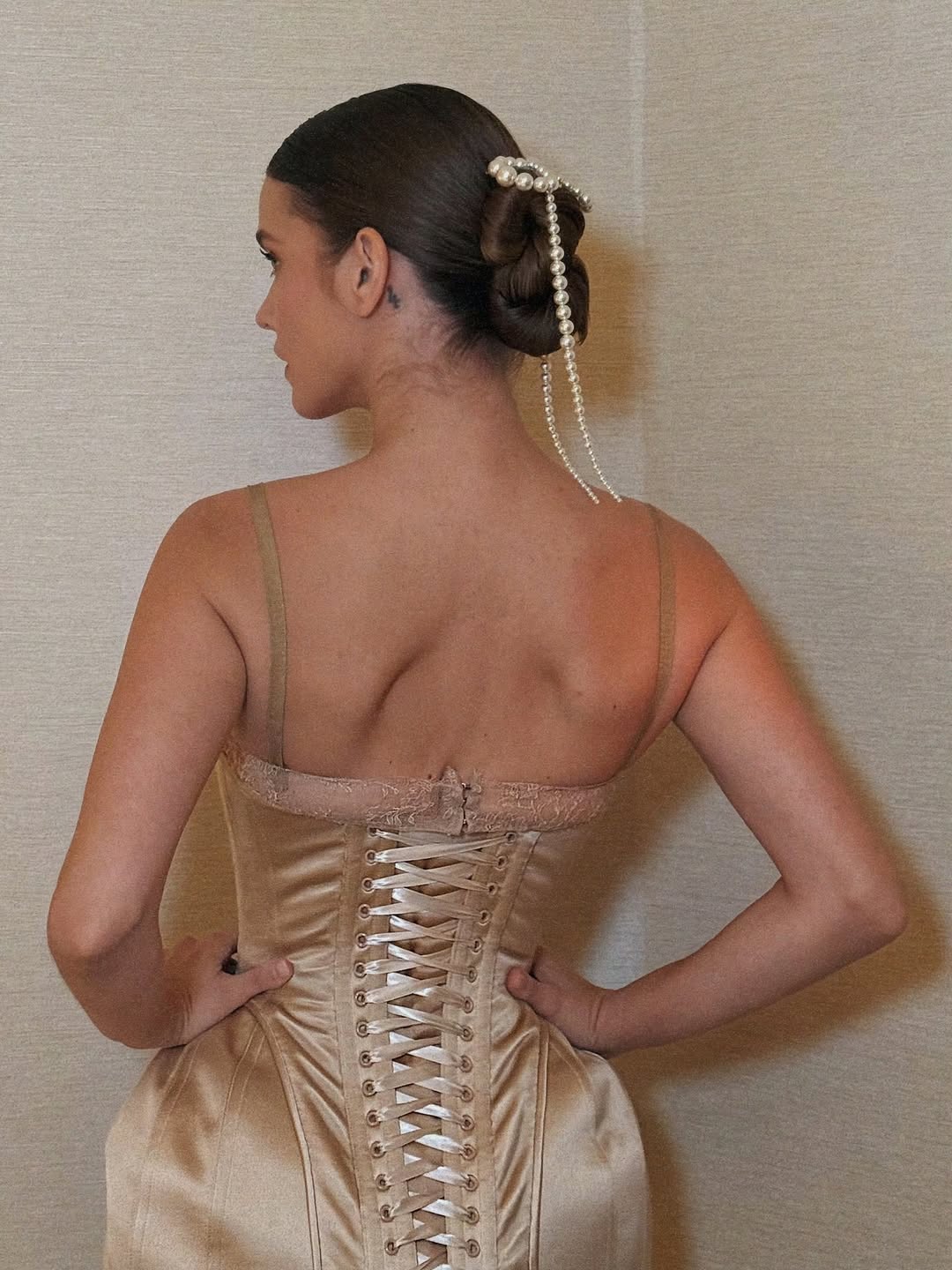The Hungarian model donned an Ashi Studio champagne bustier dress with exaggerated hips from the Fall-Winter 2025-2026 Couture collection, paired with see-through Betsey Johnson Ellis Nude pointy kitten heels cleverly turned into slingbacks for the occasion.
