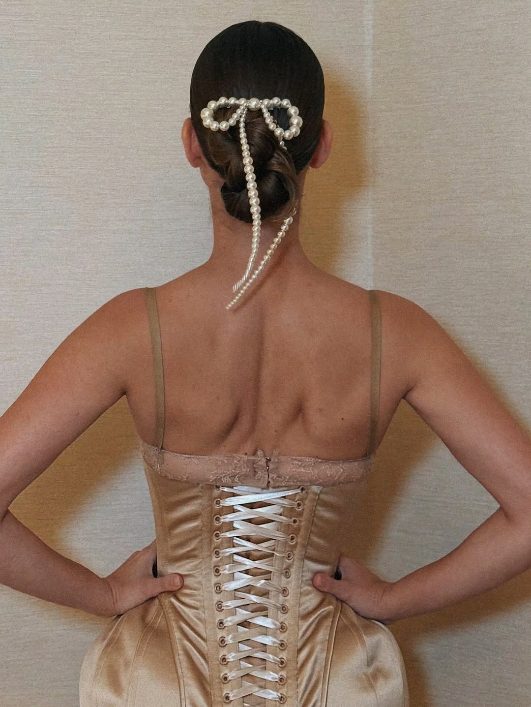 Owen Gould styled her hair in a low knotted hairdo, adorned and secured with a Jennifer Behr Presley Bow Barrette made out of hand strung crystal pearls and finished with a steel French barrette closure.