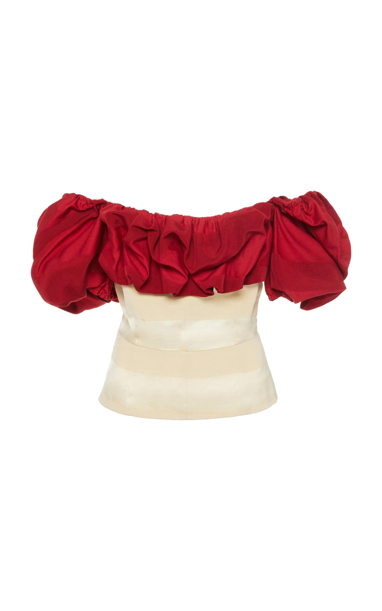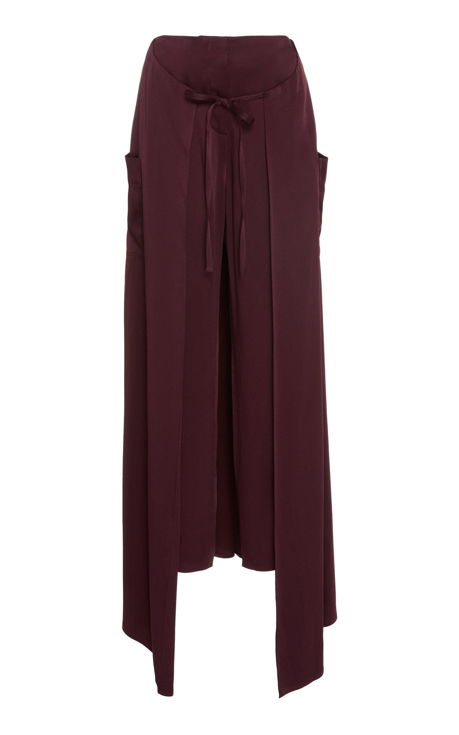 Ratajkowski wore an Ellessy ensemble made up of Windsor cape-back satin crêpe pants in burgundy and a Pool Off-the-shoulder Jacquard Bustier Top in red from the Spring 2019 Ready-to-Wear collection (look 1 from the runway).