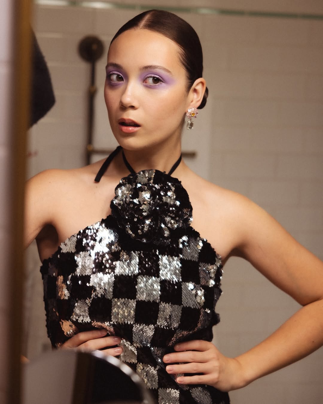 The hair was styled by Esther Langham in a middle parted do that culminated into two braided low buns, keeping up with the playful nature of the ensemble.