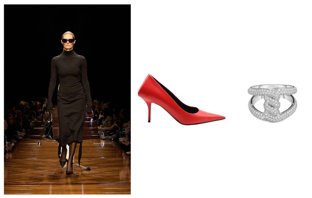 She complemented her attire with a matching pair of light red Balenciaga Square Knife pumps and a Roberto Coin PavΓ© Diamond Cialoma Twist ring in 18kt white gold with a double band on her right index finger.