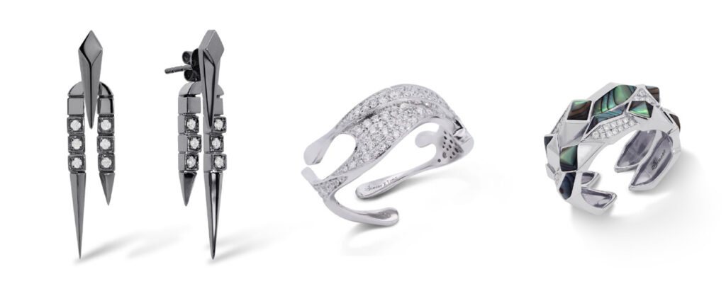 To further enrich the look, the blonde stunner opted for a pair of Simone Rockstar Punk Rock earrings in black gold, a Simone x Tomo Sumi diamond ring in white gold on her right index finger and a Simone Edgy Double Unisex ring with Abalone shell in 18k white gold on her left middle finger.