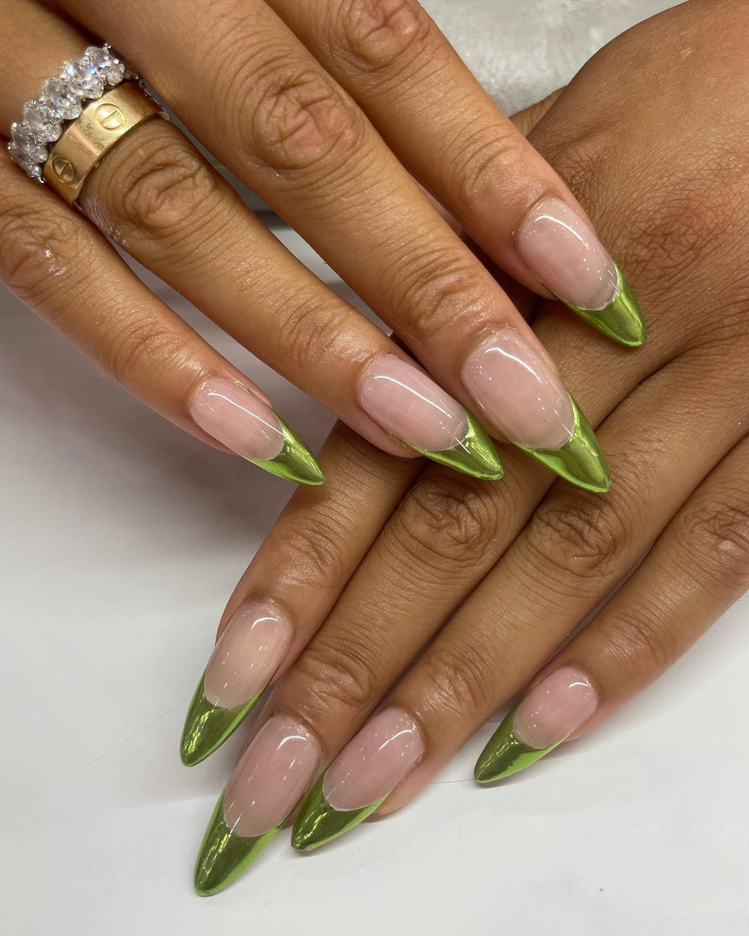 Storm’s go-to nail artist Vanny Nguyen created a chrome green French manicure for the Black beauty (it was the same Storm showed off on her birthday a few days prior), using OPI nail polishes in the shades ‘Passion‘ and ‘Alpine Snow‘ for the base. There was no mention of the chrome green shade Nguyen also used to achieve the cool manicure and which was part of the buzz online, sadly.
