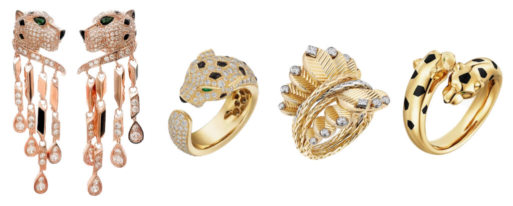 She complemented her ensemble with a small pair of Panthère de Cartier earrings in 18K rose gold, each set with 73 brilliant-cut diamonds totaling 1.56 carats, emerald and onyx, a Cartier Grain de Café bracelet on her left wrist, a yellow gold Panthère de Cartier ring half-paved on her left ring finger, a Cartier Grain de Café ring on her right ring finger and a Panthère de Cartier ring on her right index finger.